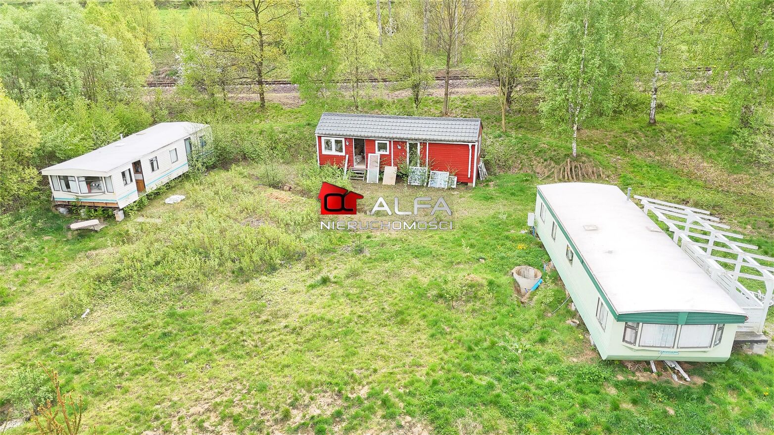 Na działce znajdują się również domki letniskowe - 3 przyczepy angielskie z dwoma sypialniami - idealne pod wynajem, stawy z pomostami, prywatny las z rzeką, w którym można stworzyć park linowy.