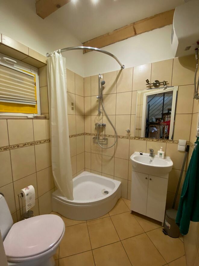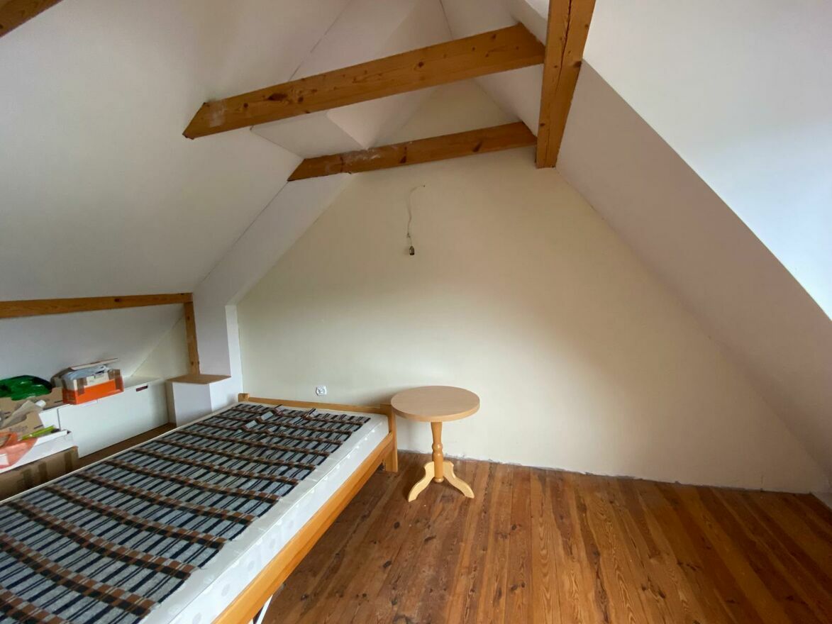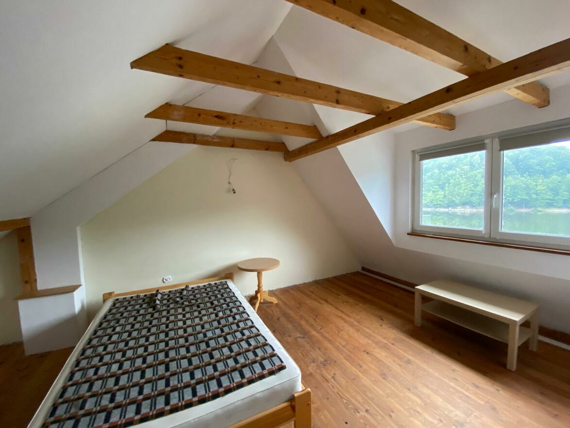 Nad salonem poddasze użytkowe z oknem na jezioro.